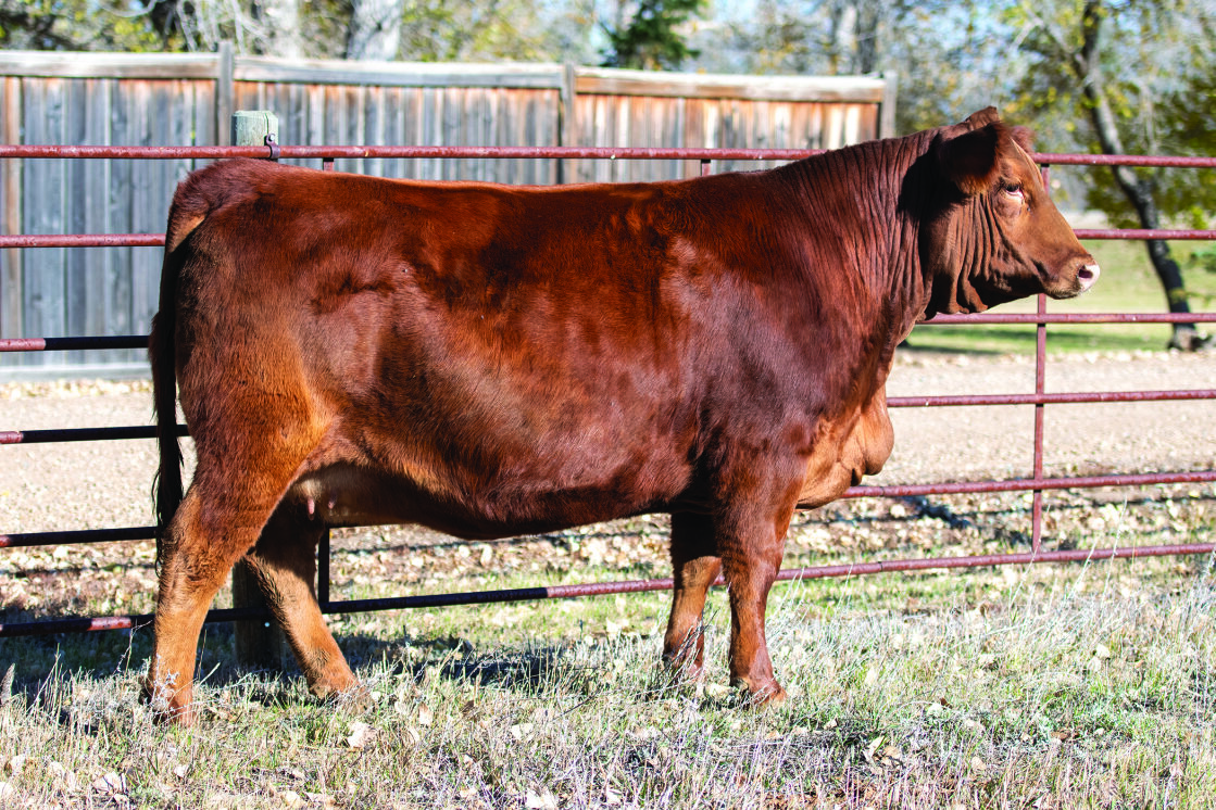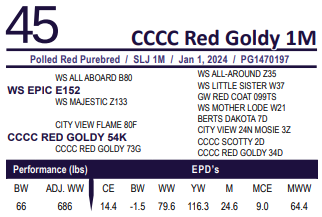 CCCC Red Goldy 1M - Heterozygous Polled. - AI bred on April 24 to Mader The Rookie exposed to CCCC Russet 65M April 26 to May 6 then East Poplar Betts 439M May 6 to 30. Preg checked safe to April 24 date.