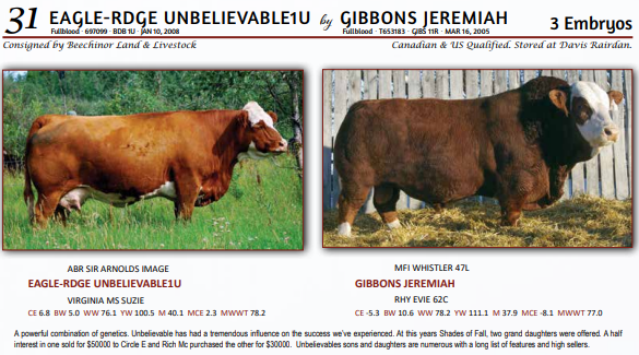 EAGLE-RDGE UNBELIEVABLE1U by GIBBONS JEREMIAH - 3 Embryos - Canadian & US Qualified. Stored at Davis Rairdan.