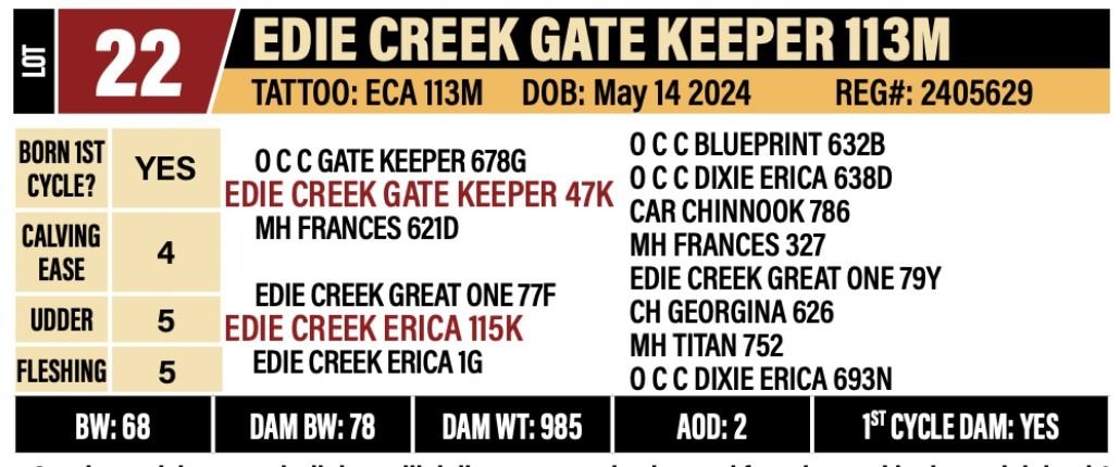 TATTOO: ECA 113M | DOB: MAY 14, 2024 | REG#: 2405629 | BW: 68 | Sale weight: 1445 | SC: 39