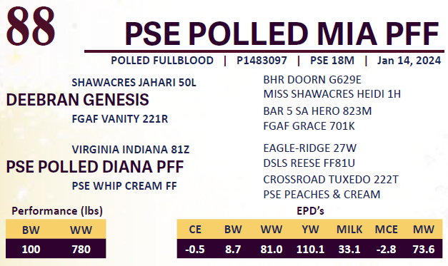 PSE POLLED MIA PFF - 100% FULL FLECKVIEH. - Bred AI Anchor D Hefner 274H, #P1324348. March 28 2025. No exposure.