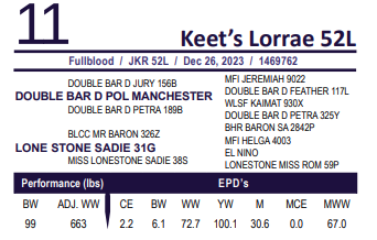 Keet’s Lorrae 52L - 100% Fleckvieh. Horned - AI’d to Keet’s Dynamic 20D March 24. Exposed to Keet’s Merino 4M April 14 to June 6. Ultrasound May 23. Safe to AI date.