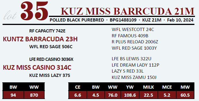 KUZ MISS BARRCUDA 21M - Bred AI to WFL Absolute 51Y on April 4, 2025.