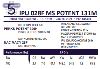 IPU 028F MS POTENT 131M - Homo Polled Red Purebred - Bred: March 31st to Wepplers Eight Ball 168M CSA #1476150. Exposed to Kuntz North Star 15L May 2 to June 2, safe to A.I.