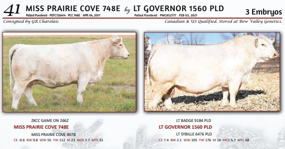 MISS PRAIRIE COVE 748E by LT GOVERNOR 1560 PLD - 3 Embryos - Canadian & US Qualified. Stored at Bow Valley Genetics. GUARANTEE - ONE PREGNANCY IF IMPLANTED BY CERTIFIED TECHNICIAN.