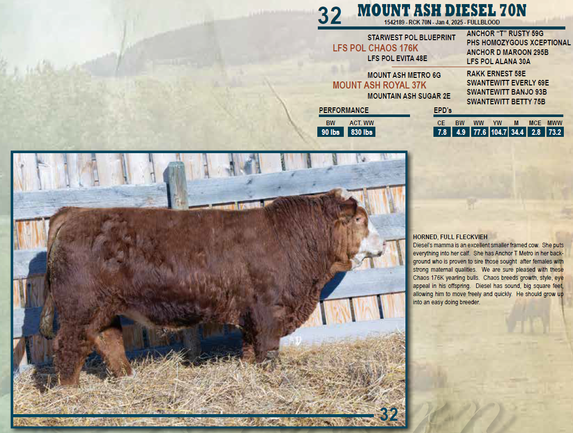 MOUNT ASH DIESEL 70N - HORNED, FULL FLECKVIEH
