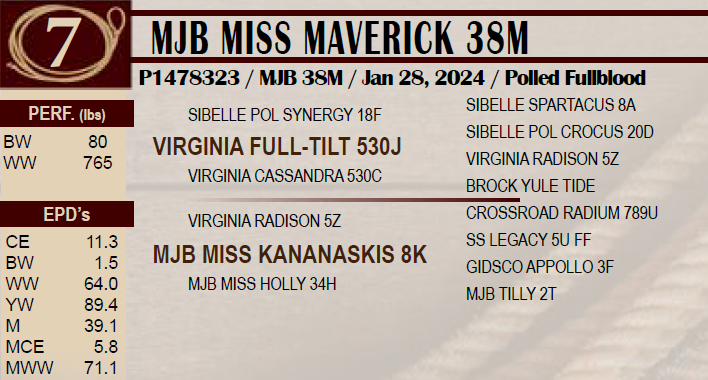 MJB MISS MAVERICK 38M - Polled - AI bred to BEL Steward 2nd-354007 on March 27,2025 Exposed MJB Lucas 24L-1440767- April 11-June 01,2025. Pregnant to the exposure bull