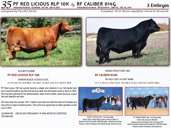 PF RED LICIOUS RLP 10K by RF CALIBER 014G - 3 Embryos - Canadian, US & Mexico Qualified. Stored at Bovatech. GUARANTEE - ONE 60 DAY PREGNANCY IF IMPLANTED BY CERTIFIED TECHNICIAN.