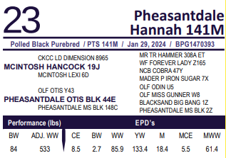 Pheasantdale Hannah 141M - HOMO POLLED. HOMO BLACK. - Exposed March 30-June 3 to Pheasantdale Sin City 276L. Observed bred April 17, safe to observation.