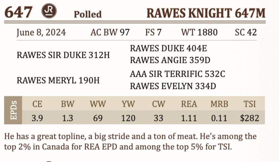 He has a great topline, a big stride and a ton of meat. He’s among the top 2% in Canada for REA EPD and among the top 5% for TSI.