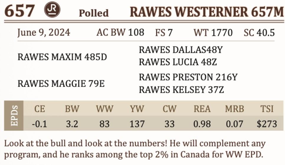 Look at the bull and look at the numbers! He will complement any program, and he ranks among the top 2% in Canada for WW EPD.