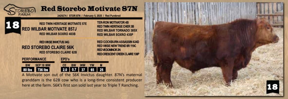 A Motivate son out of the 56K Invictus daughter. 87N’s maternal granddam is the 62B cow who is a long-time consistent producer here at the farm. 56K’s first son sold last year to Triple T Ranching.