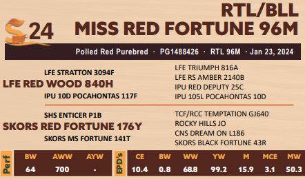 RTL/BLL MISS RED FORTUNE 96M - HOMOZYGOUS POLLED - RTL 96M Exposed to BEE Alpha 915J March 20 to March 26th then exposed to NAC Maverick 57M from March 27 th to May 31st. Observed bred March 31st and ultrasound safe to that date