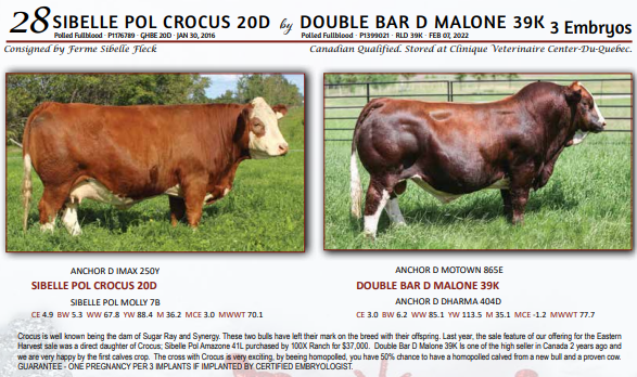 SIBELLE POL CROCUS 20D by DOUBLE BAR D MALONE 39K - 3 Embryos - Canadian Qualified. Stored at Clinique Veterinaire Center-Du-Quebec. GUARANTEE - ONE PREGNANCY PER 3 IMPLANTS IF IMPLANTED BY CERTIFIED EMBRYOLOGIST.