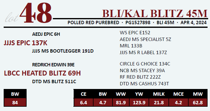 BLI/KAL BLITZ 45M - Homo Polled - Bred AI March 26 WLB Top Tier – Observed Bred April 15 Lazy MC Watchout 414L – Safe (exposed Apr 10 – May 31 to same)