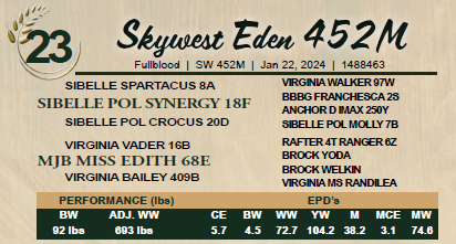 Skywest Eden 452M - Dilutor Free - Bred March 28, 2025 to Crossroad Titan 14L. Exposed March 20 - May 16, 2025