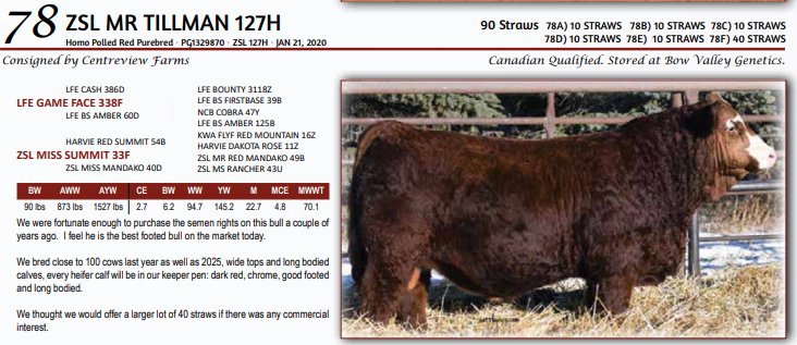 ZSL MR TILLMAN 127H - 40 STRAWS - Canadian Qualified. Stored at Bow Valley Genetics.